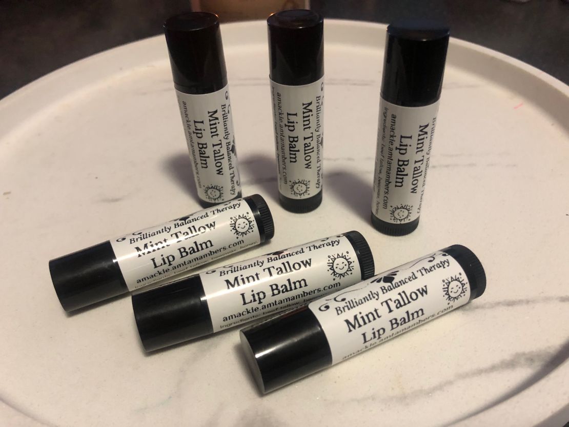 4 simple ingredients...beef tallow, beeswax, honey, peppermint essential oil.